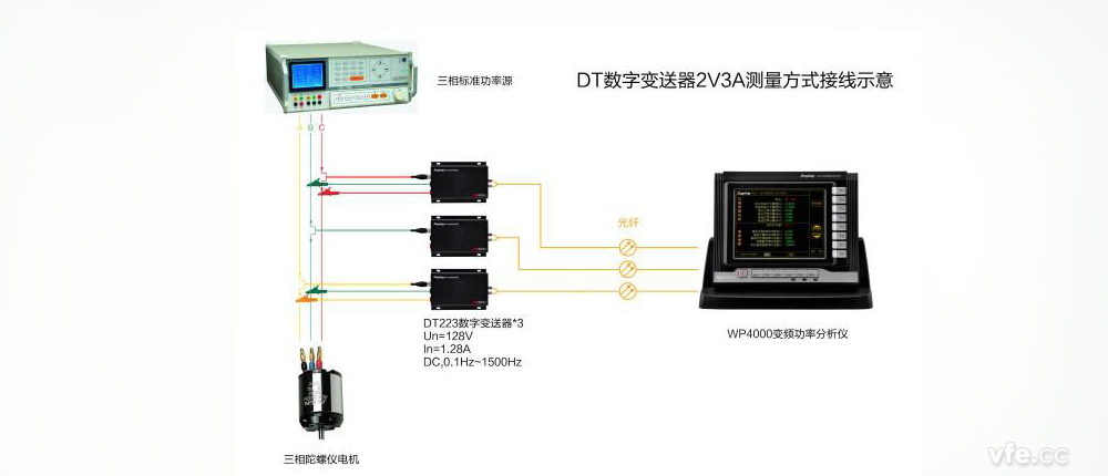 本次測試采用湖南銀河電氣有限公司研制的WP4000變頻功率分析儀,該分析儀是目前國家變頻電量測量儀器計量站的測量基準,測試數據具有較高的精度和最高的權威性。 根據被測電機的電壓和電流,WP4000 的功率單元選擇 DT223B(128V/1.28A)數字變送器。每個DT 數字變送器可連接一路電壓和一路功率。 由于電機未引出中性線,一般采用二瓦計法測量三相功率,為了更加準確直接的反映三相電流,每相電流均采用一個DT數字變送器進行測量。